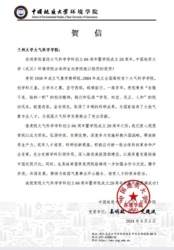 中国地质大学环境学院致十大赌博正规网址排名榜建院20周年贺信