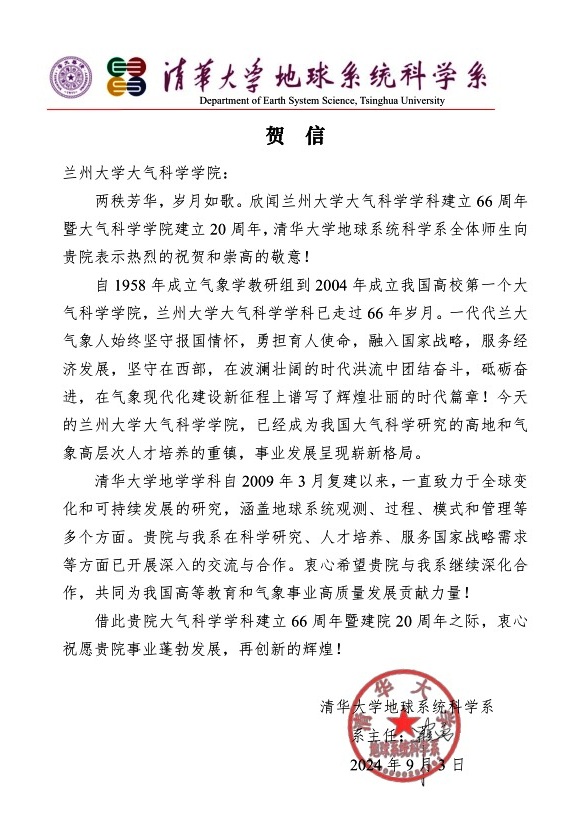 清华大学地球系统科学系致十大赌博正规网址排名榜建院20周年贺信