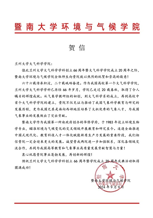 暨南大学环境与气候学院致十大赌博正规网址排名榜建院20周年贺信