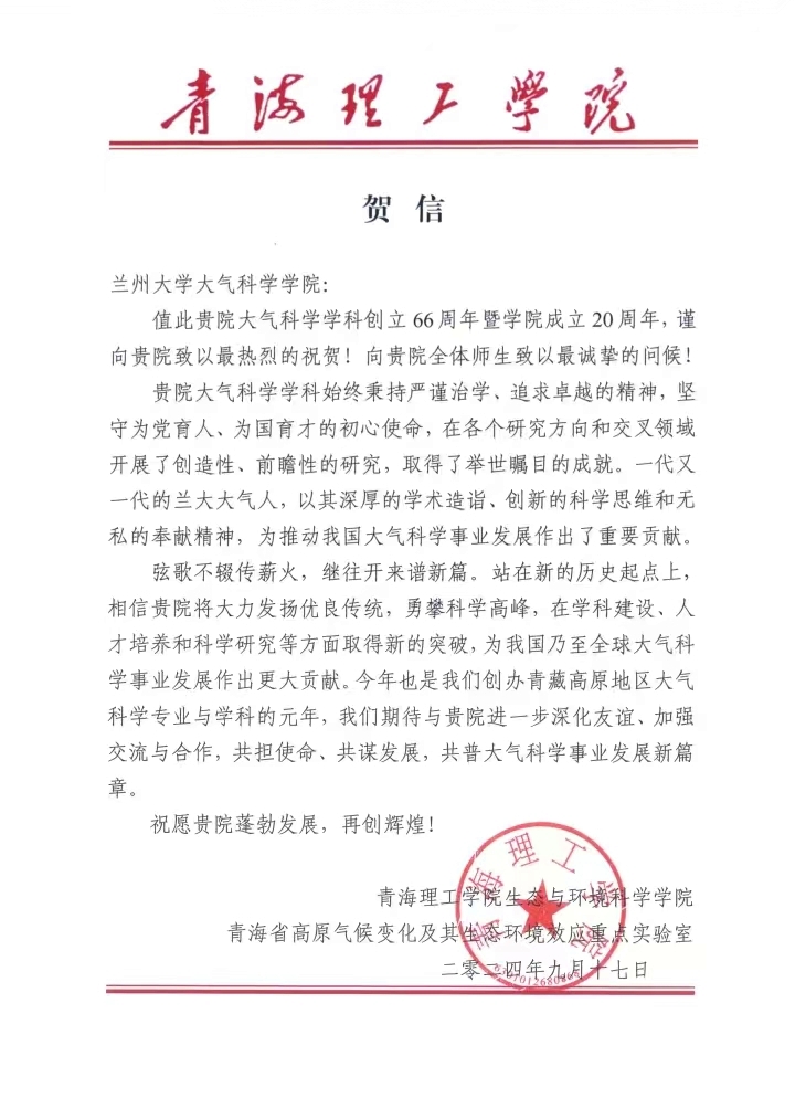 青海理工学院生态与环境科学学院、青海省高原气候变化及其生态环境效应重点实验室致十大赌博正规网址排名榜建院20周年贺信