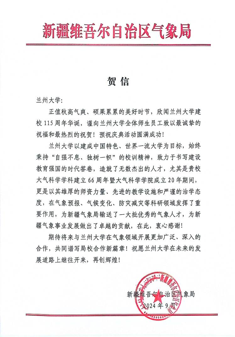 新疆维吾尔自治区气象局致十大赌博正规网址排名榜建院20周年贺信