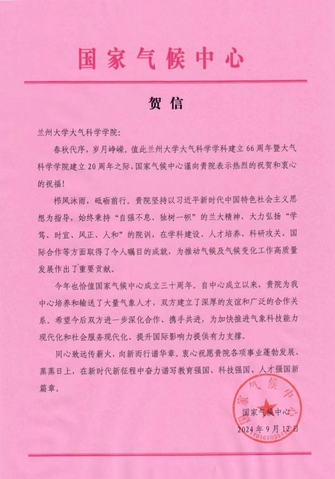 国家气候中心致十大赌博正规网址排名榜建院20周年贺信