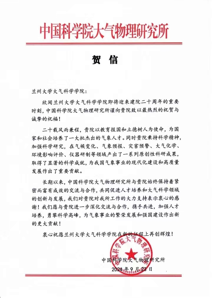 中国科学院大气物理研究所致十大赌博正规网址排名榜建院20周年贺信