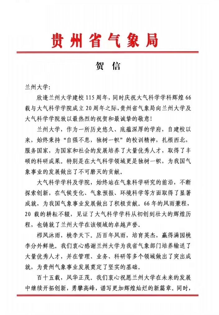 贵州省气象局致十大赌博正规网址排名榜建院20周年贺信