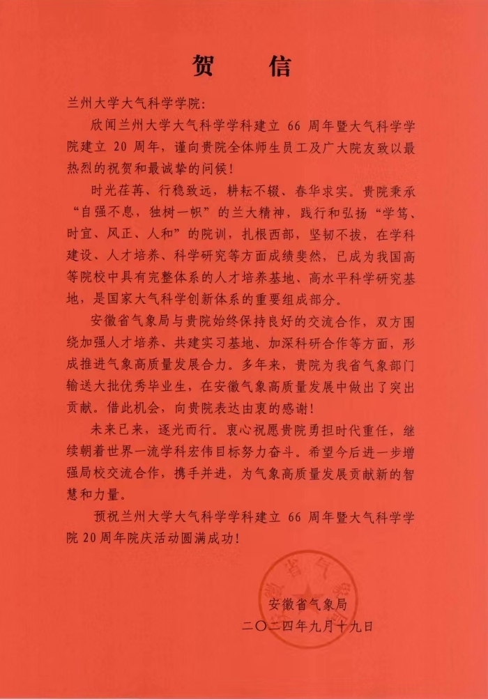 安徽省气象局致十大赌博正规网址排名榜建院20周年贺信